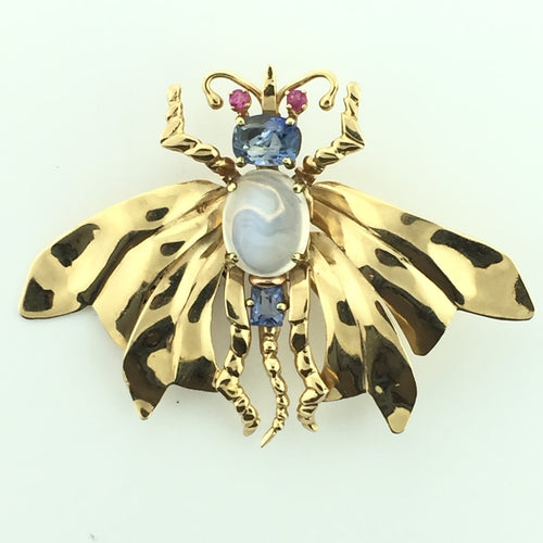 MOONSTONE FLY PIN 14K YG WITH PINK AND BLUE SAPPHIRES