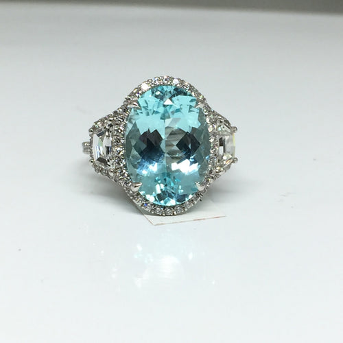 PLATINUM OVAL AQUAMARINE AND DIAMOND RING