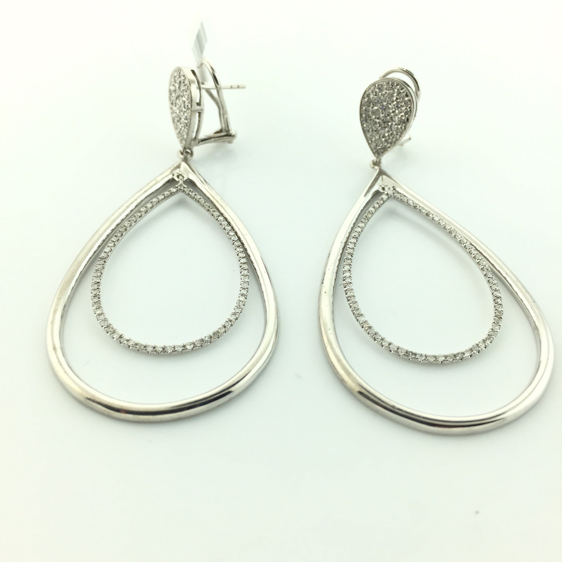 14K white gold drop earrings, pear shape, with 1.05cts total weight of diamonds