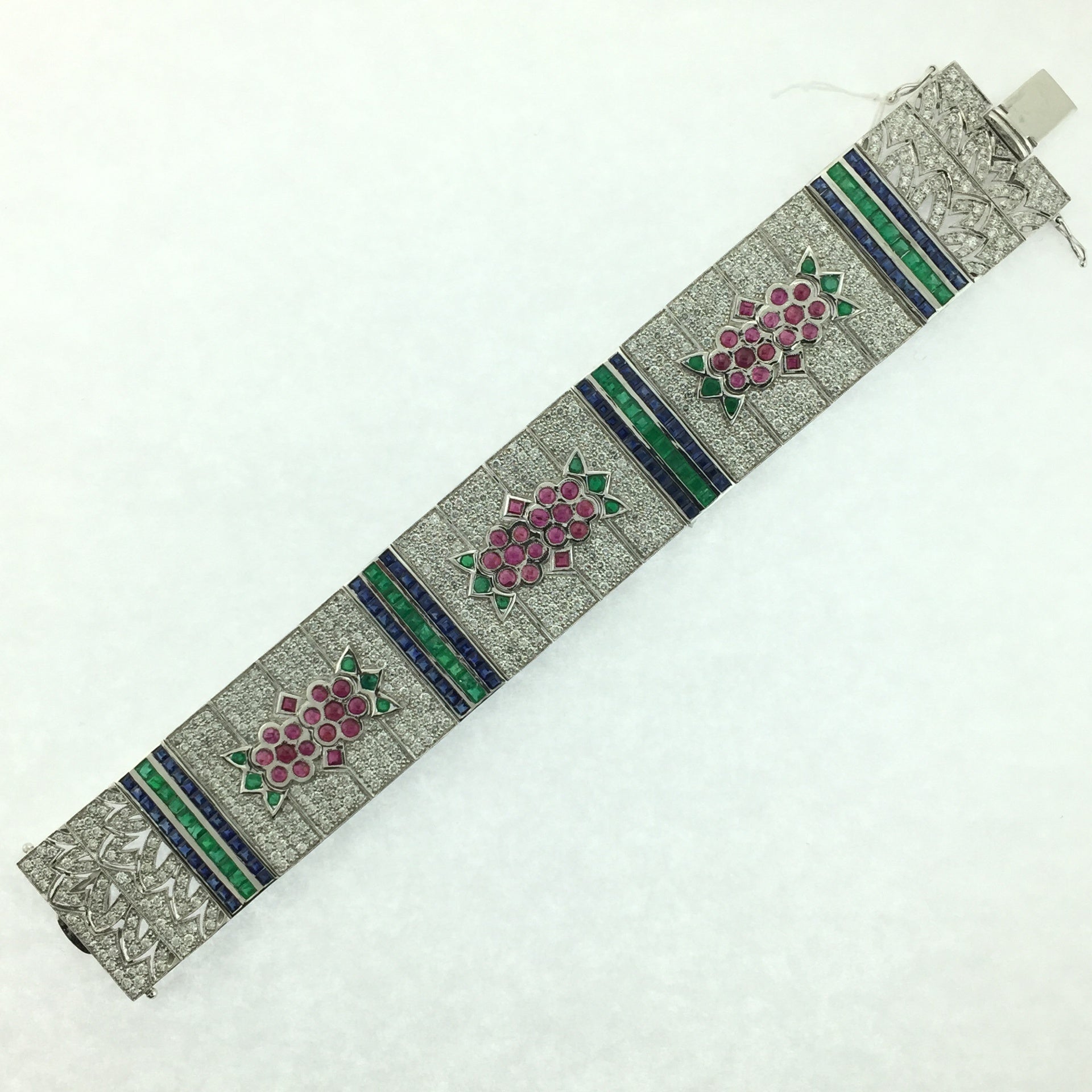 Estate 14k white gold bracelet with ruby, sapphire, emerald and eight carats of diamonds