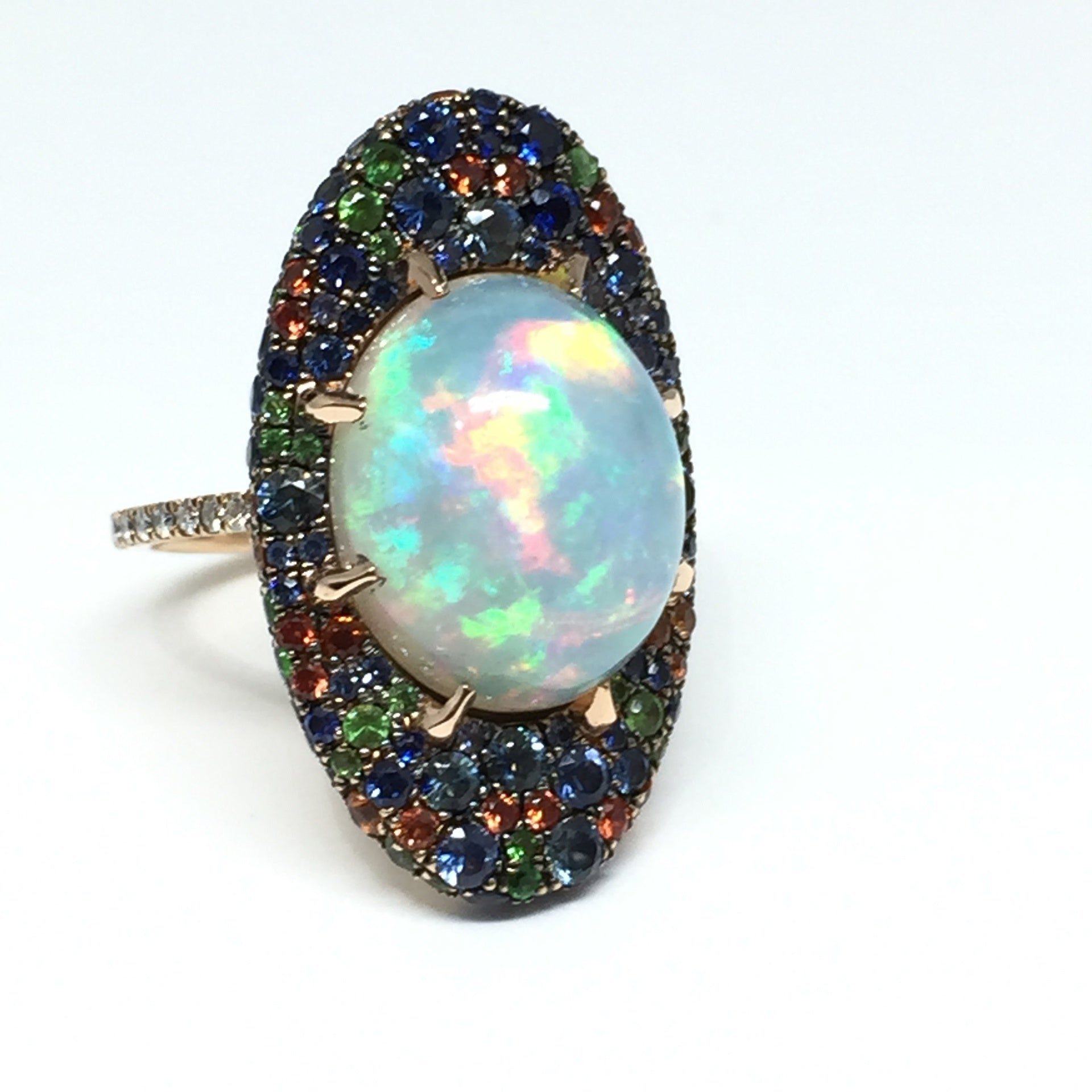 18K ROSE GOLD OPAL RING 5.85 CT 1.20 CT SAPPHIRES AND TSAVORITES AND .15 CT DIAMONDS