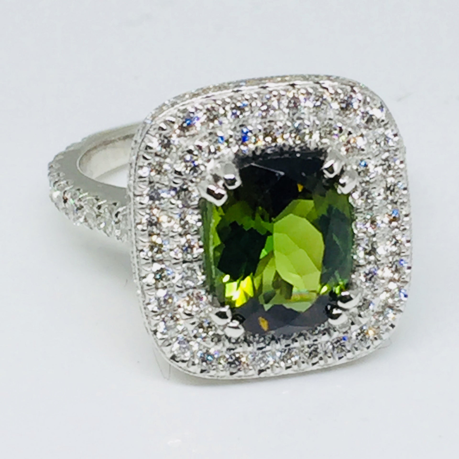 18K WG DIAMOND AND GREEN TOURMALINE RING DOUBLE HALO