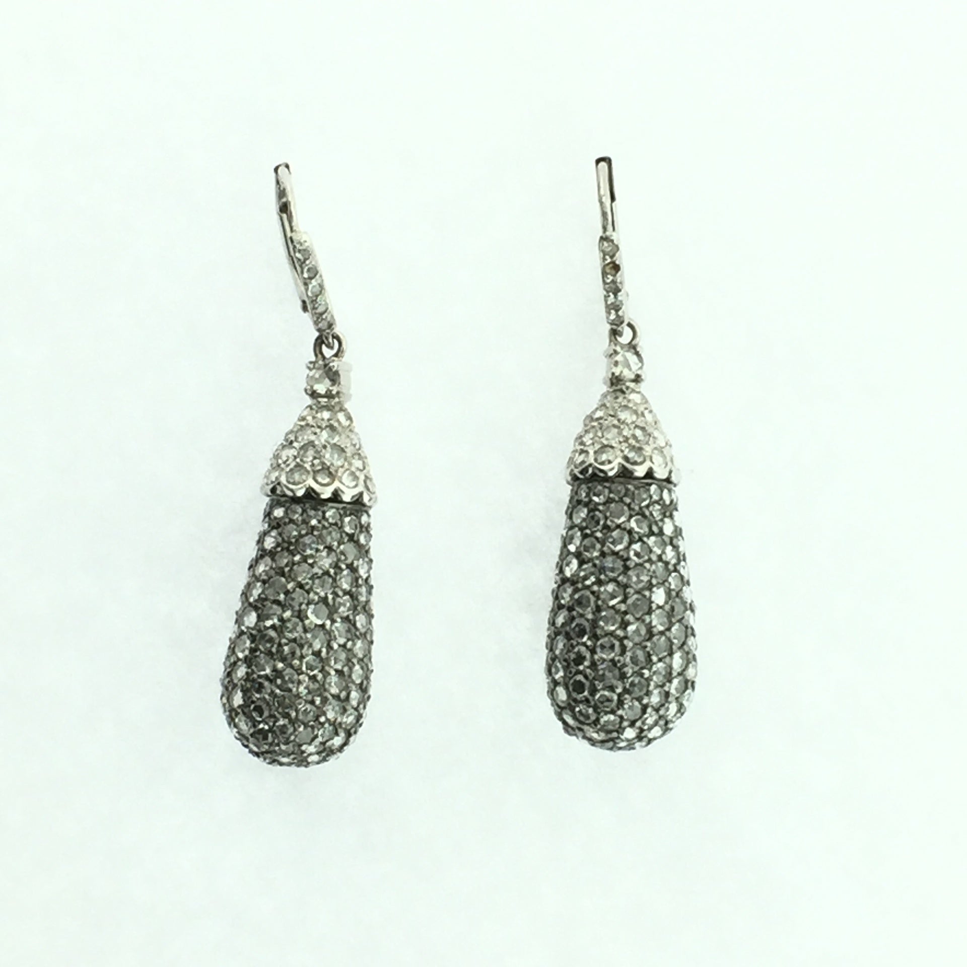 Black and white diamond earrings in 18k white gold. The diamonds have a combined total weight of 7.05 carats.