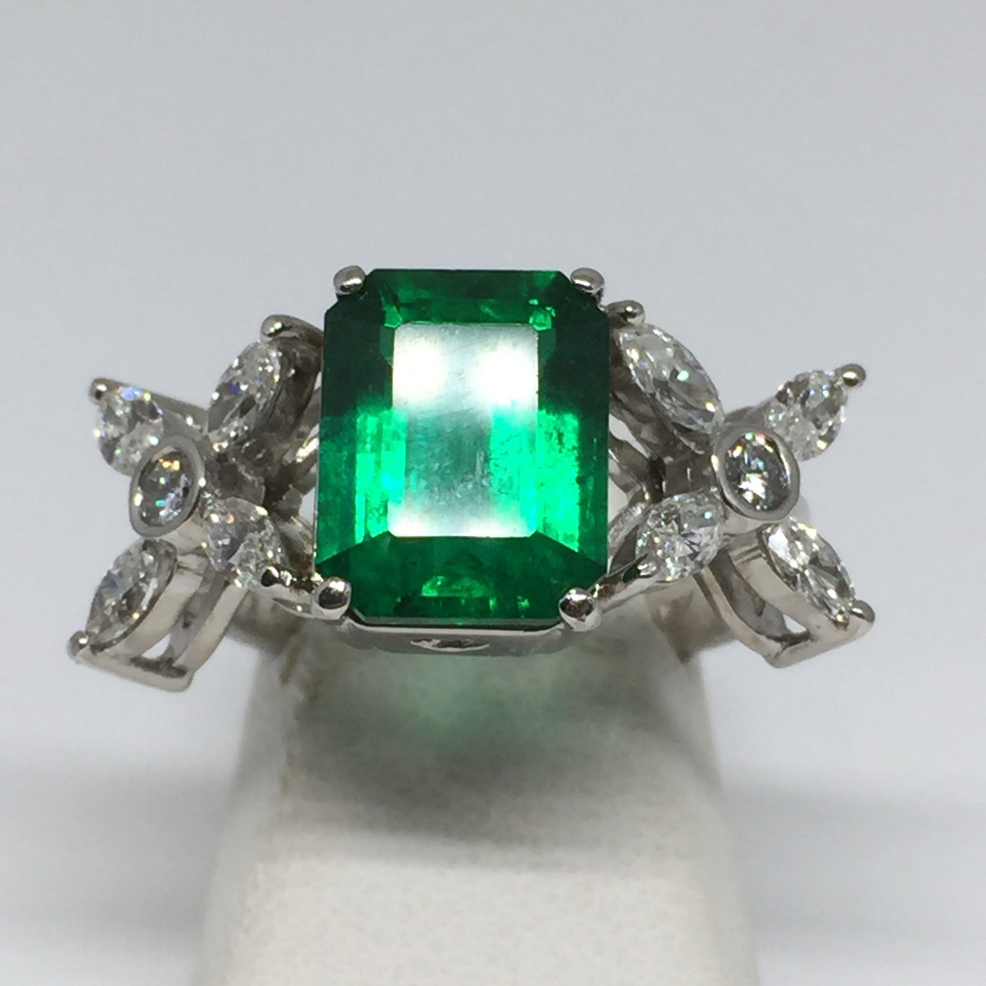 18K white gold 3.92ct. emerald cut emerald and diamond ring.