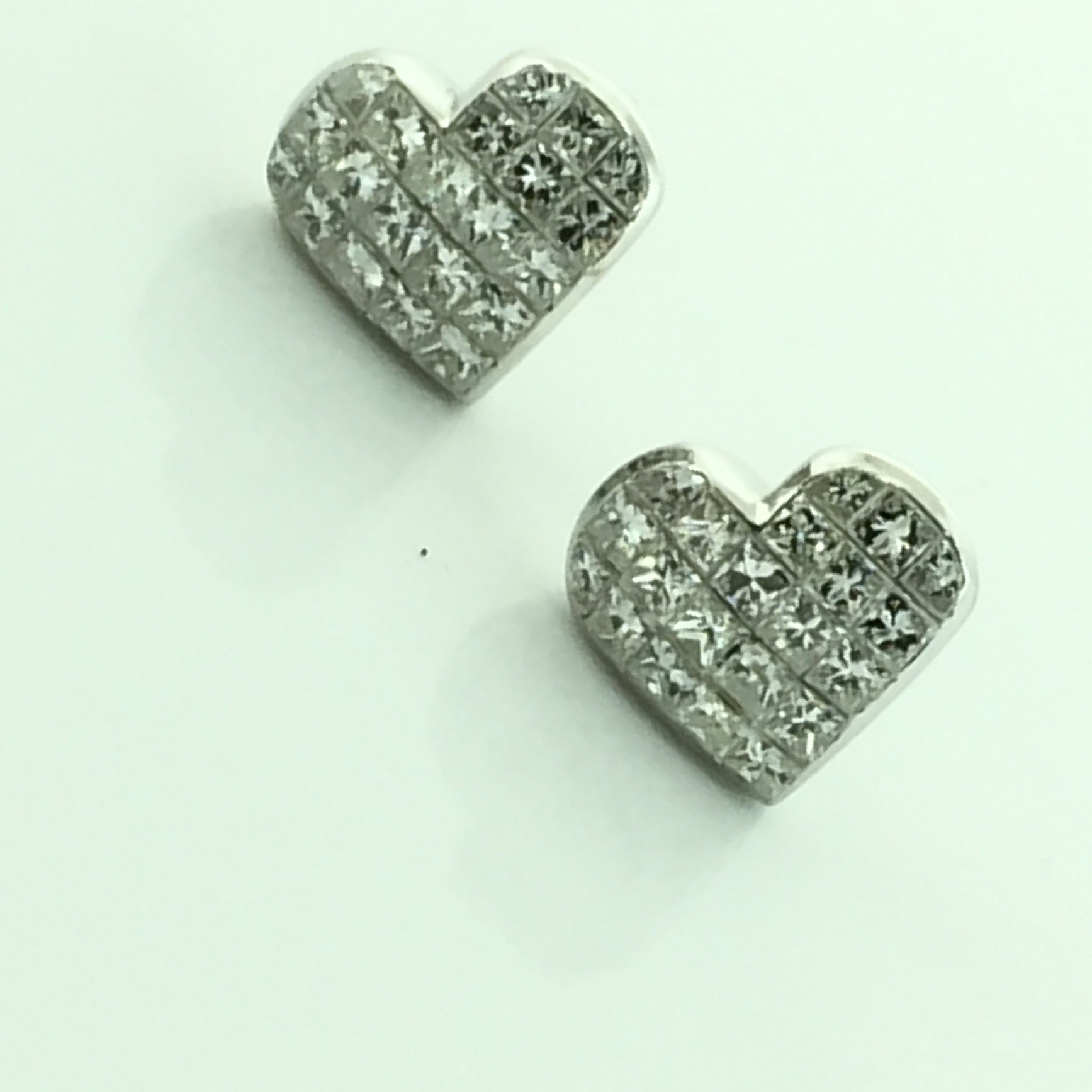 18K white gold invisibly set diamond heart earrings. The total weighof diamonds is 1.54 carats.