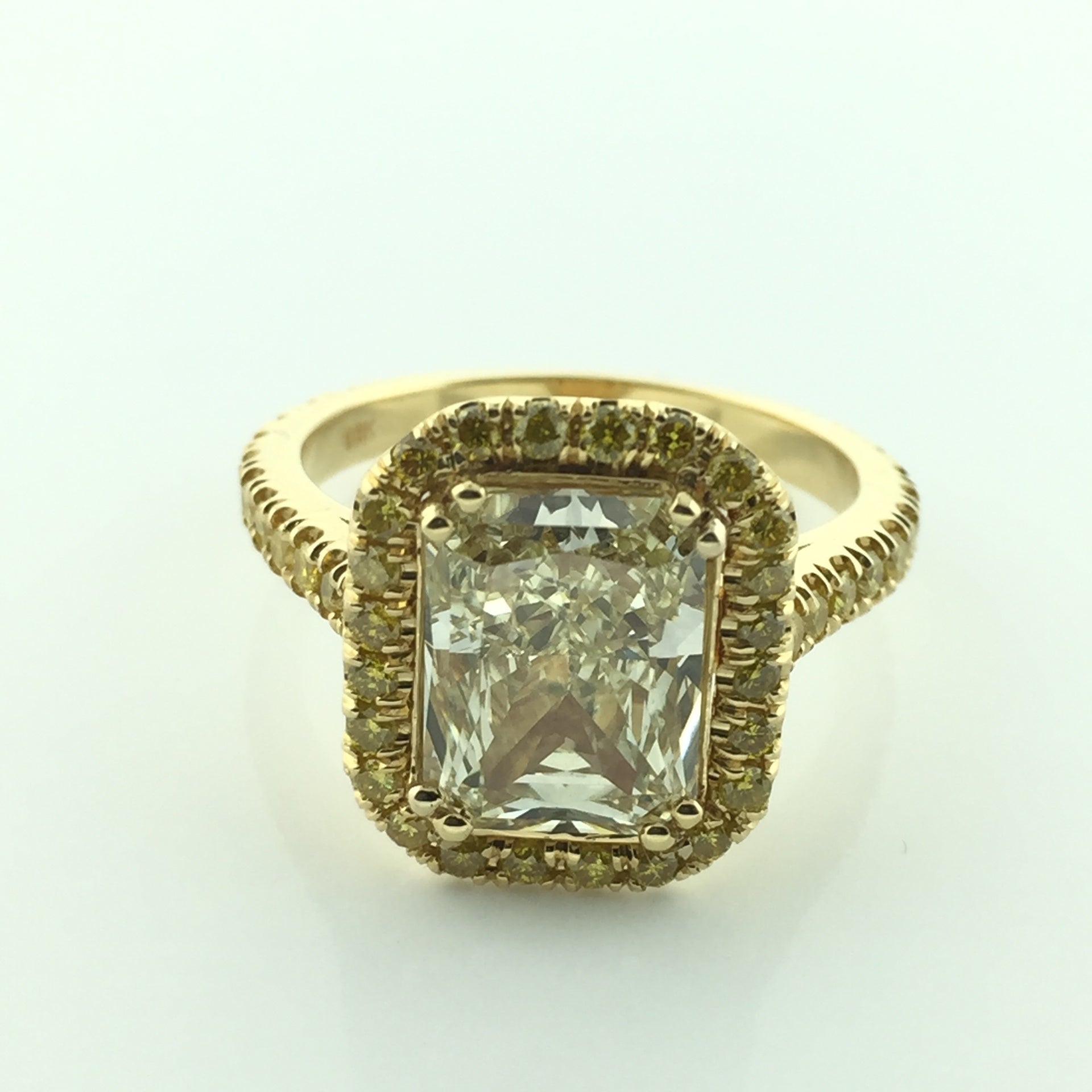 Ring with a 3.03 carat radiant cut fancy light yellow diamond accented with 0.66 carats of yellow diamonds in an 18K yellow gold mounting.