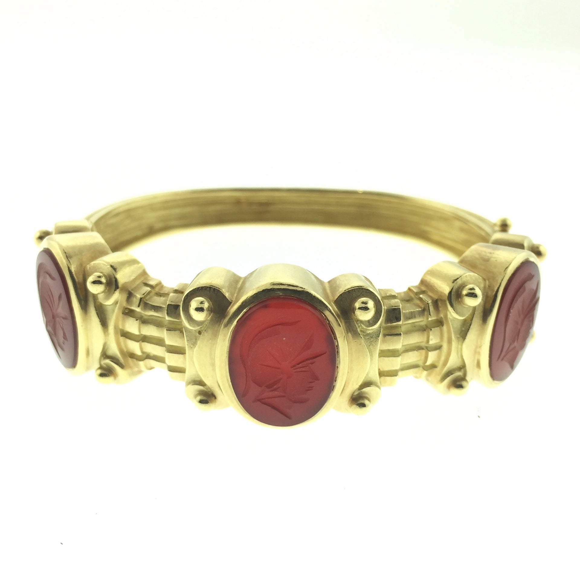 THREE STONE (CARNELIAN) INTAGLIO CUFF BRACELET IN 18K GREEN GOLD.