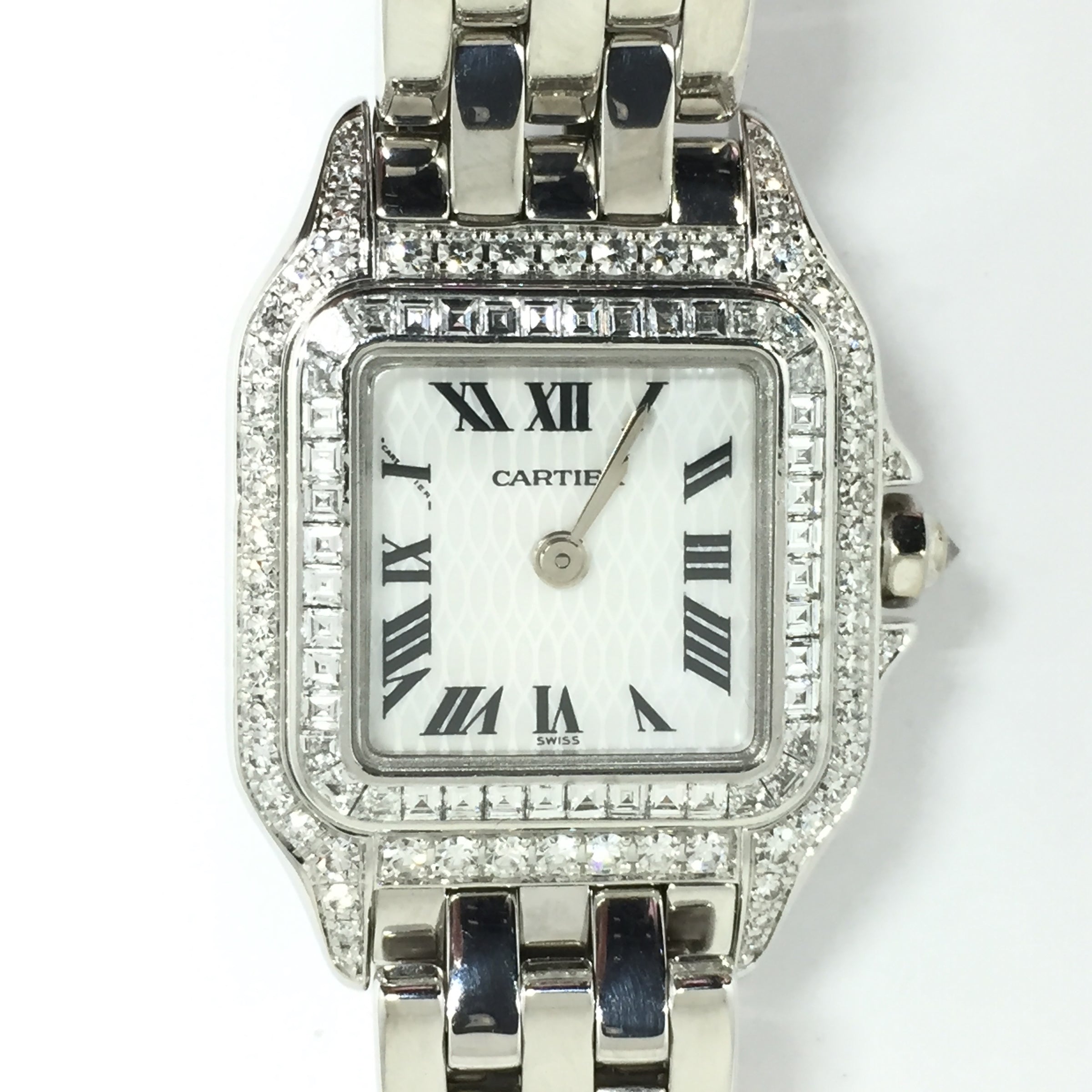 18K white gold Cartier Panthere with diamond case and bezel. Quartz movement ~ original box.