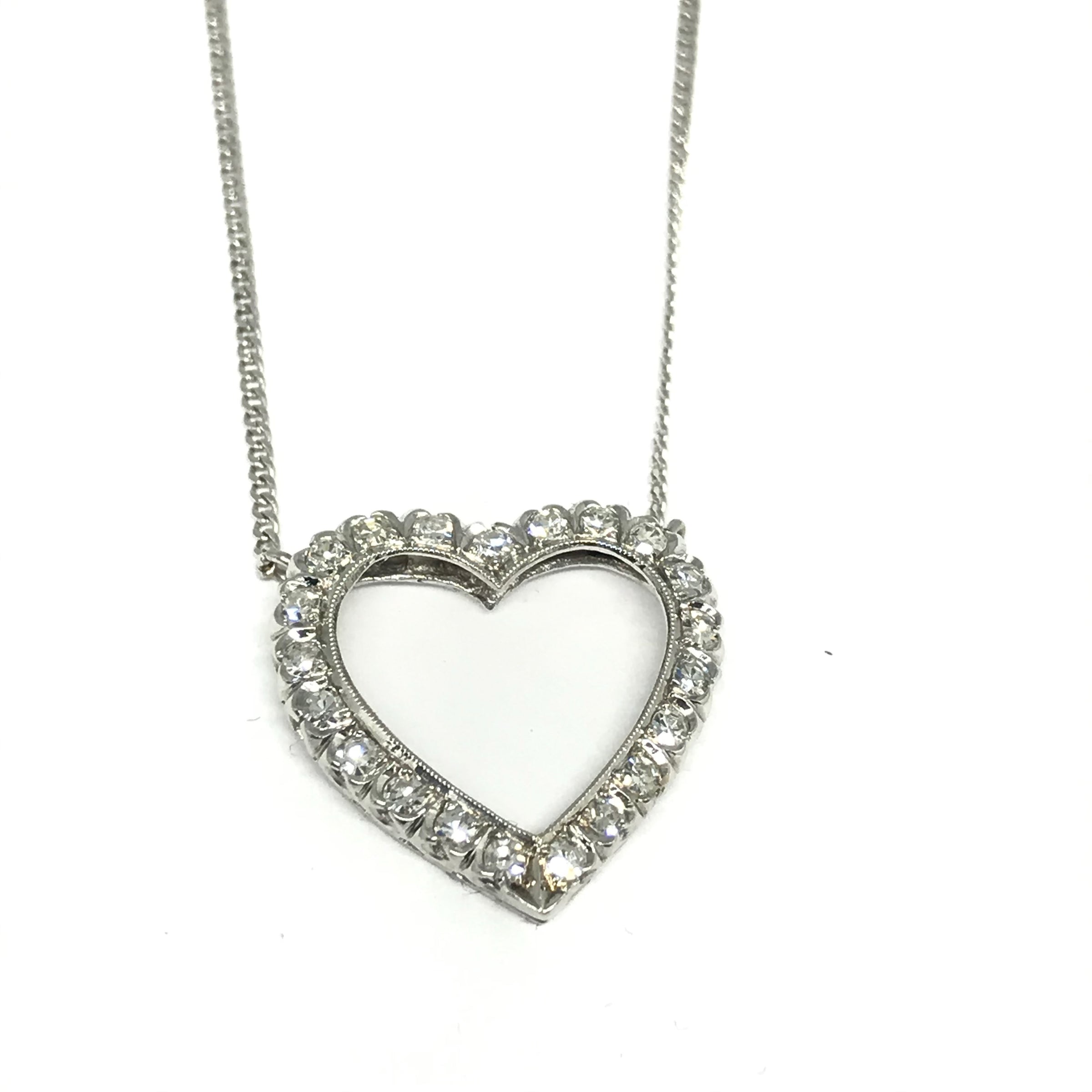 14K WHITE GOLD HEART NECKLACE WITH SINGLE CUT DIAMONDS.