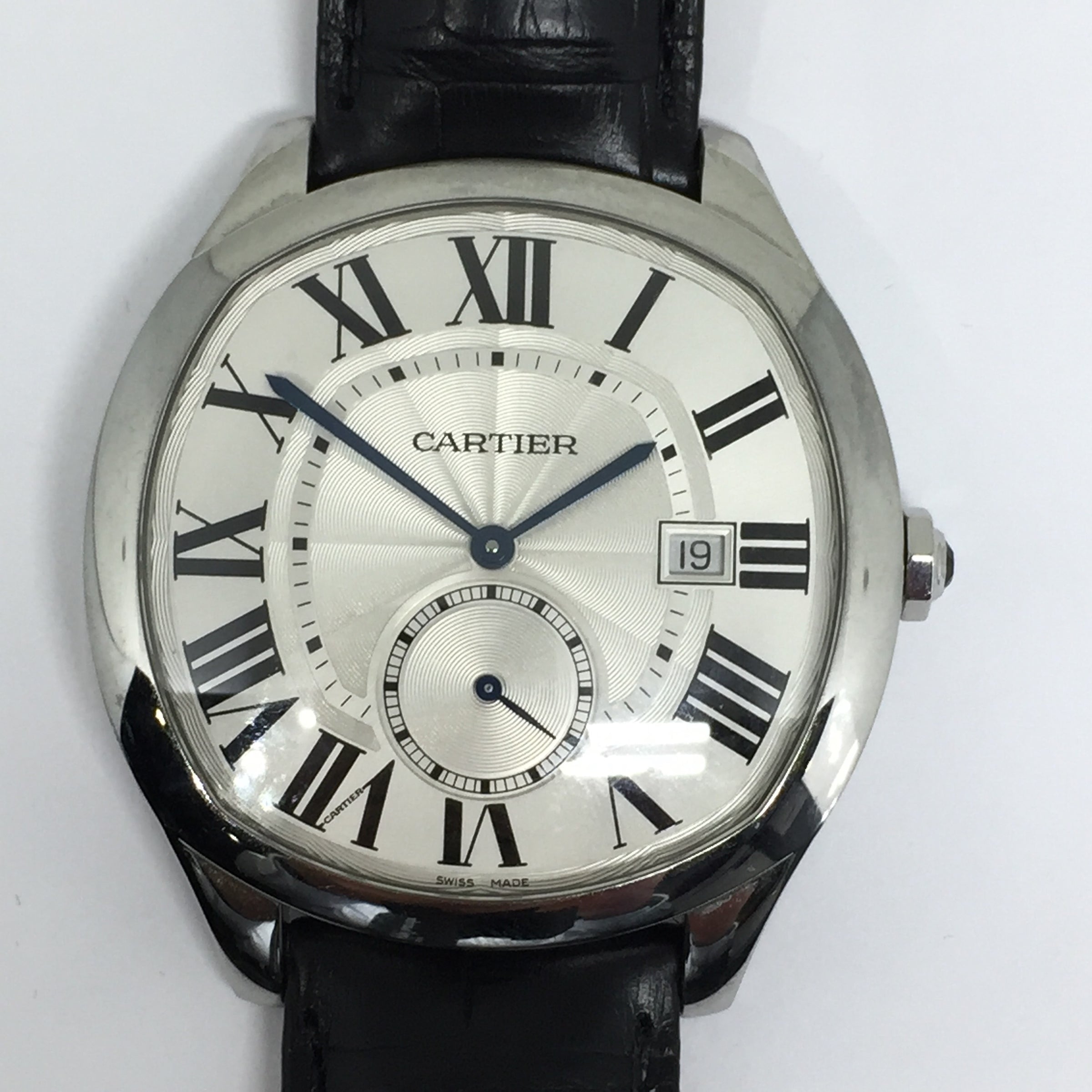Drive de Cartier watch, self-winding mechanical movement. Steel case, length: 40 mm, width: 41 mm, thickness: 11.25 mm, octagonal steel crown set with a faceted synthetic spinel. Silvered flinqué dial, Roman numerals, blued-steel hands. Sapphire crystal. Black semi-matte alligator skin strap. Calendar aperture at 3 o'clock, small seconds counter at 6 o'clock, sapphire case back. Water-resistant to 3 bar (approx. 30 meters/100 feet).