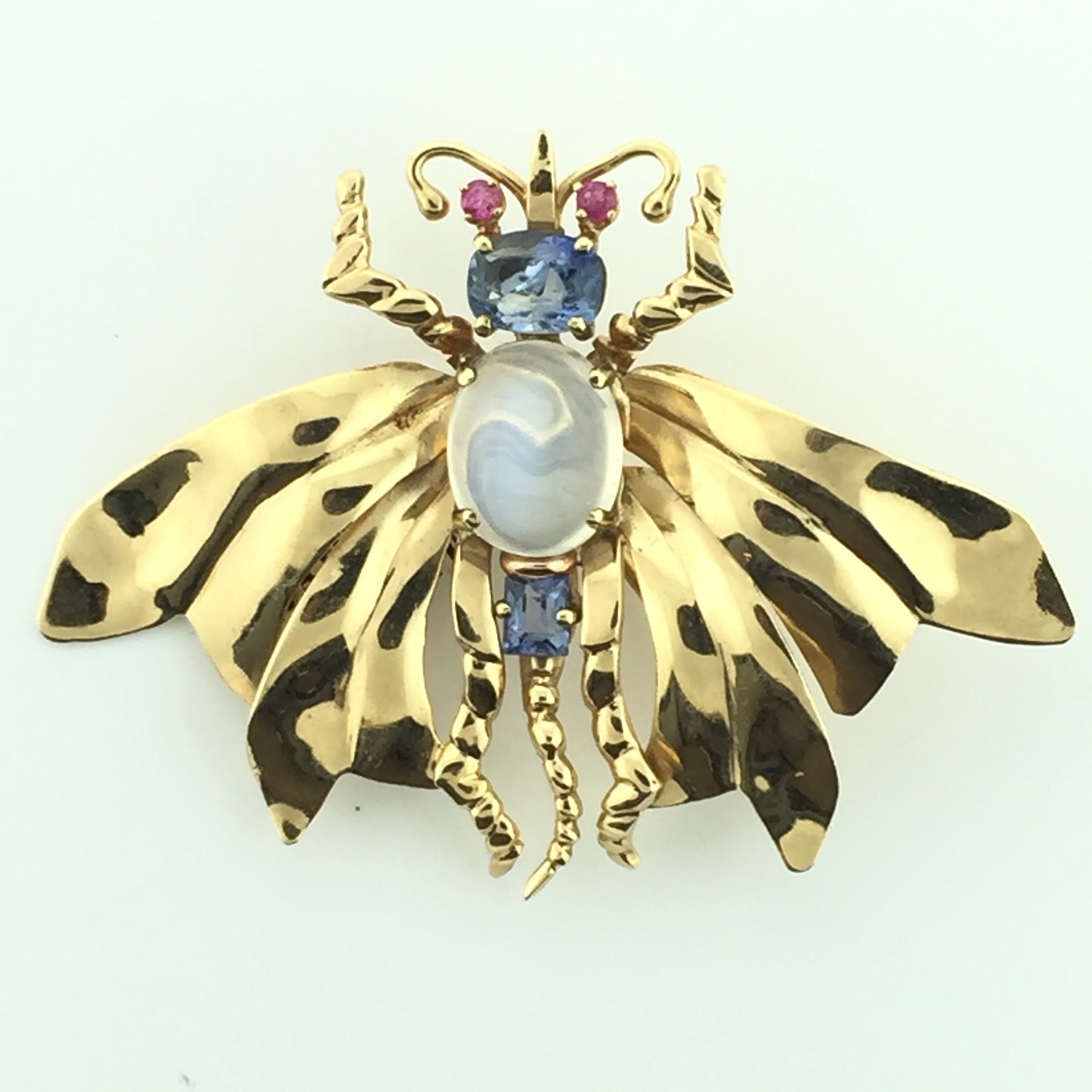 14k yellow gold fly pin with moonstone, pink and blue sapphires.