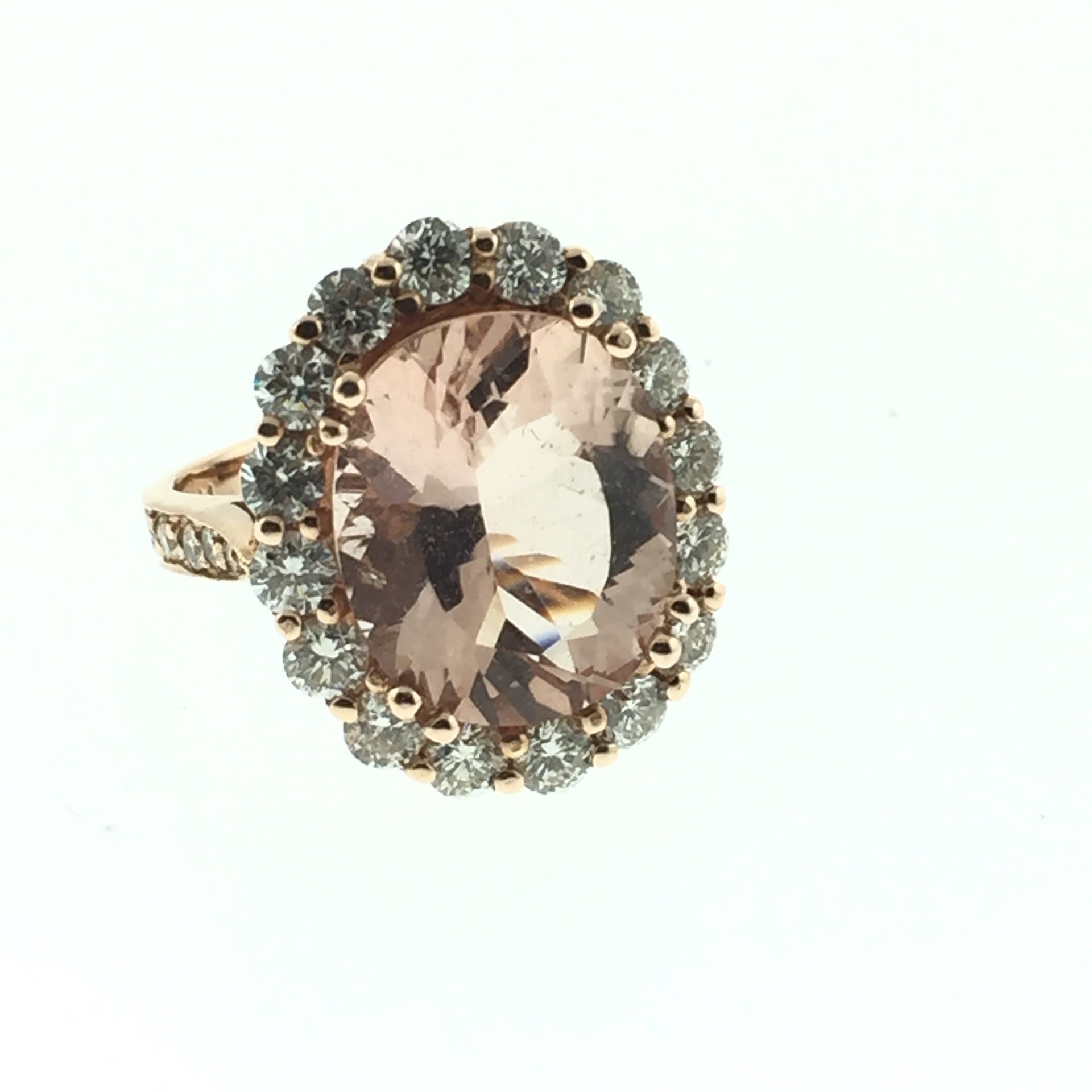 14K ROSE GOLD RING FEATURING A MORGANITE STONE WITH A DIAMOND HALO.