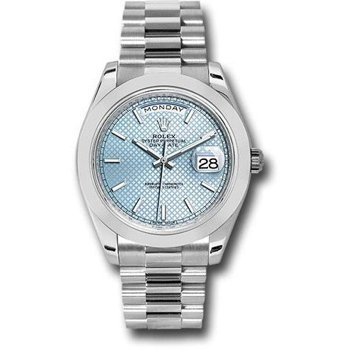 40mm 950 platinum case, screw-down back with Rolex fluting, screw-down crown with twinlock double waterproofness system, smooth bezel, scratch-resistant double anti-reflective sapphire crystal with cyclops lens over the date, ice blue diagonal motif dial, index hour markers with Chromalight, Rolex calibre 3255 automatic movement with centre hour, minute and seconds hands, instantaneous day and date in apertures, unrestricted rapid-setting, and stop-seconds for precise time setting, approximately 70 hours of power reserve, President bracelet with three-piece solid links comprised of a polished center link, satin-finished outer links, and ceramic inserts, concealed folding Crownclasp buckle. Waterproof to 100 meters